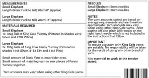 Knitting pattern by King Cole - Leaflet 9109.Elephant toys in Yummy/Funny Yummy.Pattern features (finished sizes): Small; 20cm.
