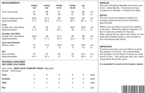 - Please see second image for suggested yarns, needle sizes and quantities required to make the garments