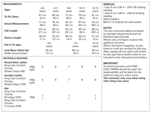 - Please see second image for suggested yarns, needle sizes and quantities required to make the garments