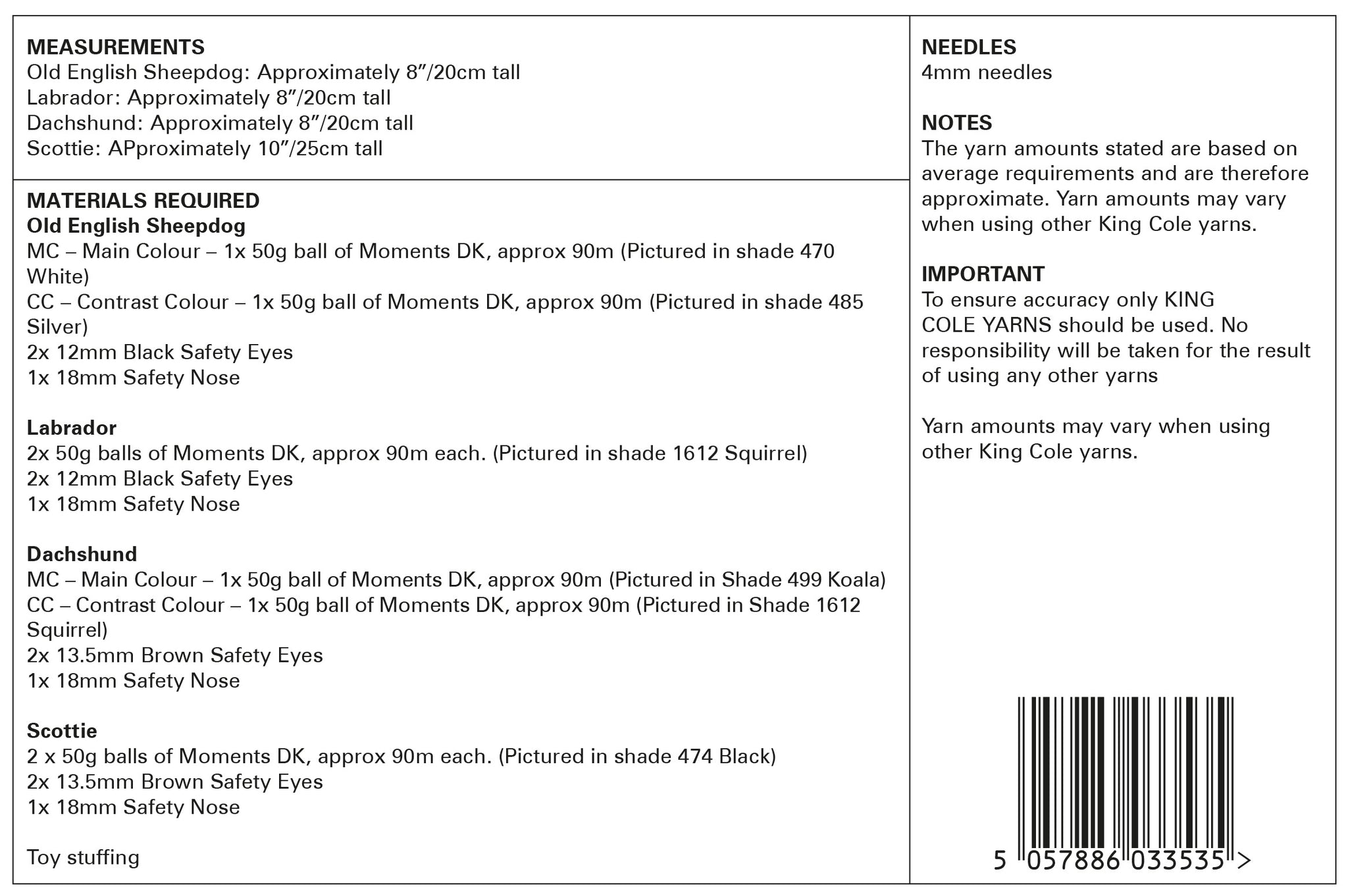 - Please see second image for suggested yarns, needle sizes and quantities required to make the garments