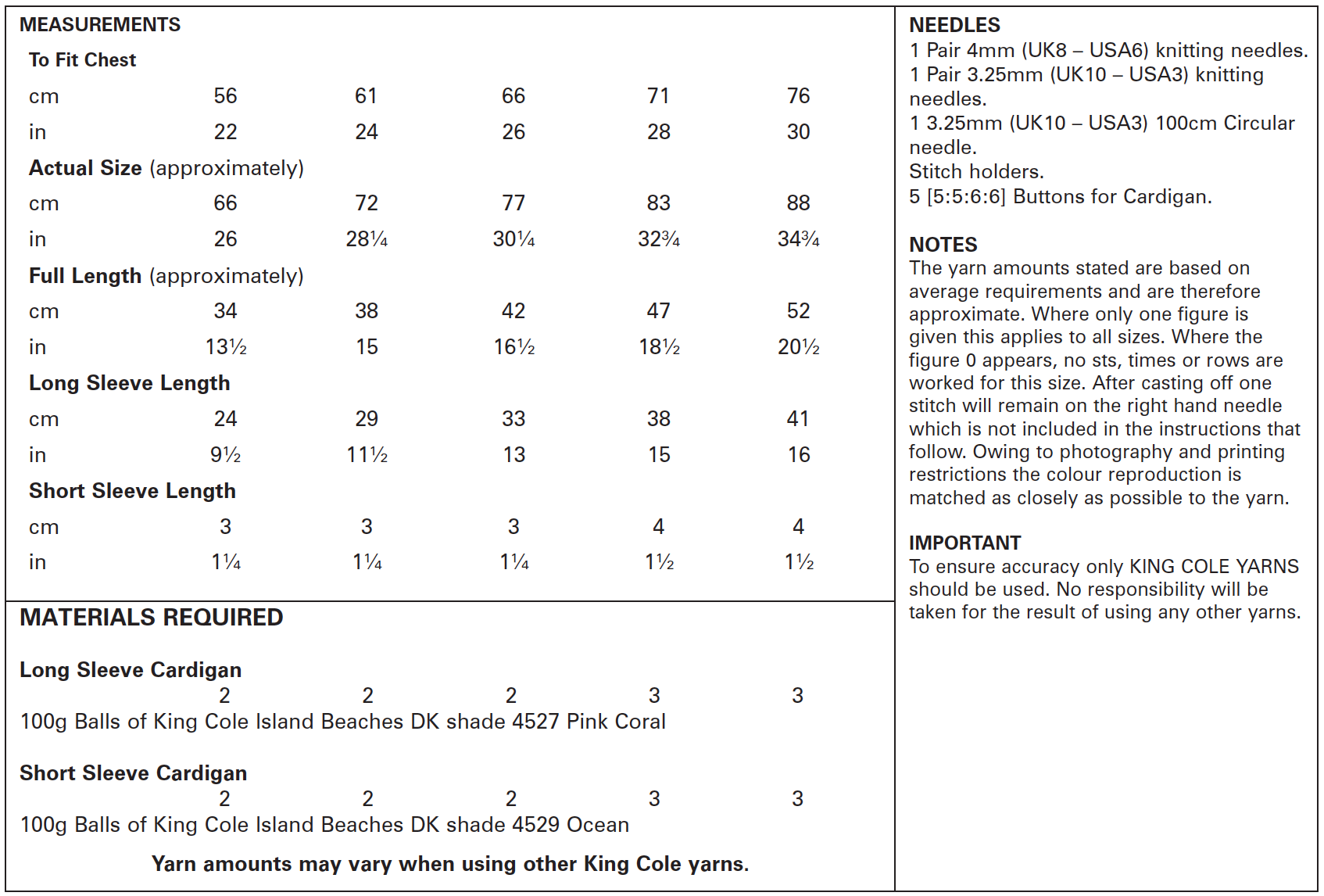 - Please see the second image for garment/item sizes and number of balls/needles required