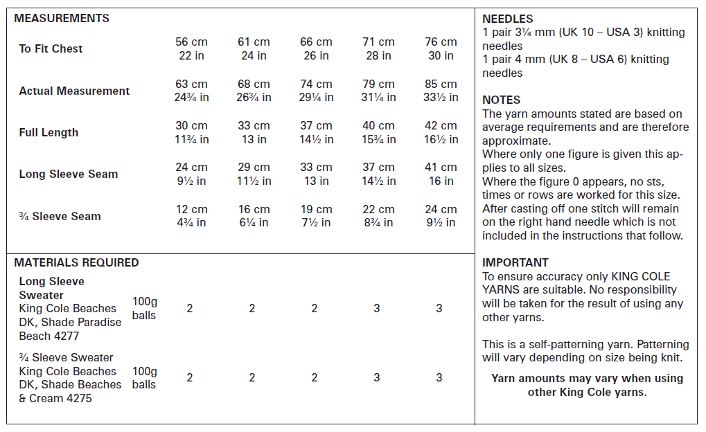 - Please see the second image for garment/item sizes and number of balls/needles required