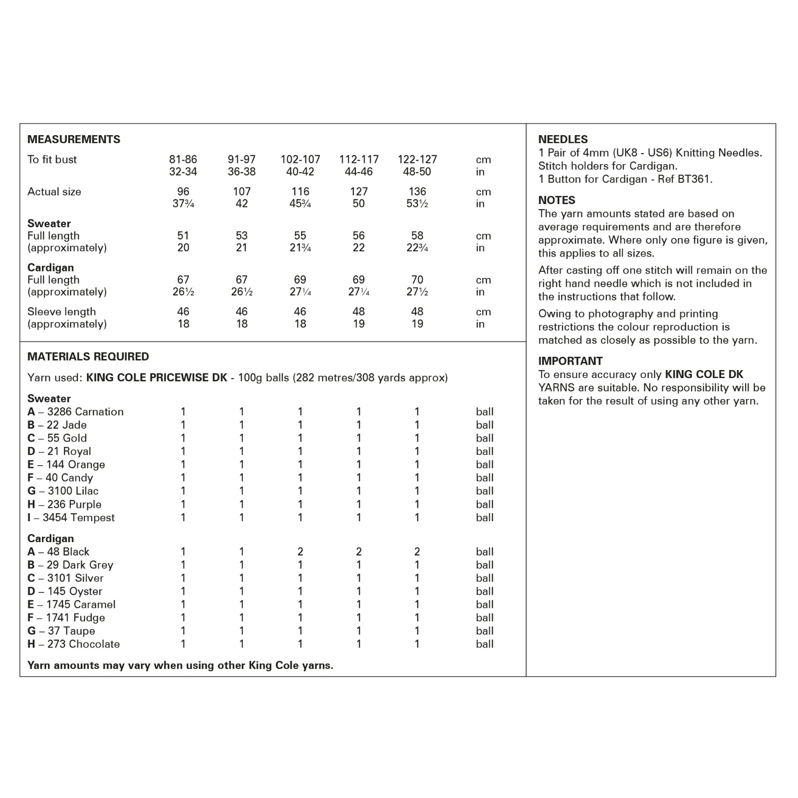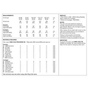 - Please see second image for suggested yarns, needle sizes and quantities required to make the garments