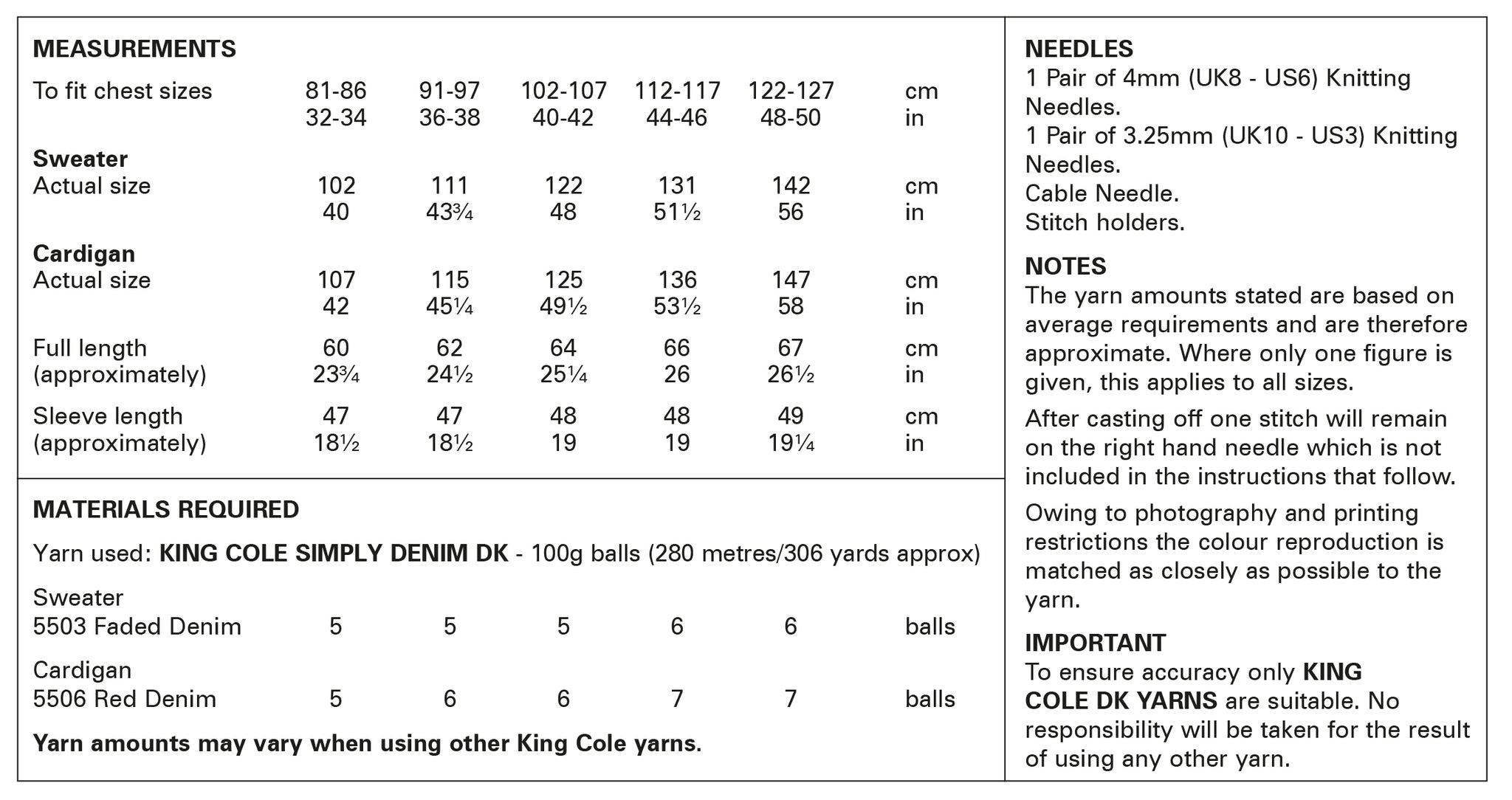 - Please see second image for suggested yarns, needle sizes and quantities required to make the garments