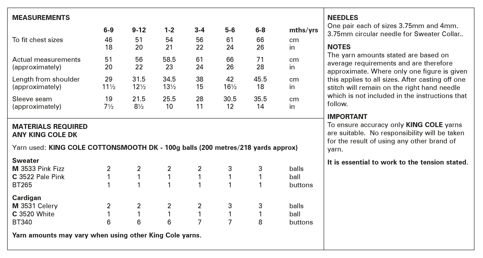 - Please see second image for suggested yarns, needle sizes and quantities required to make the garments