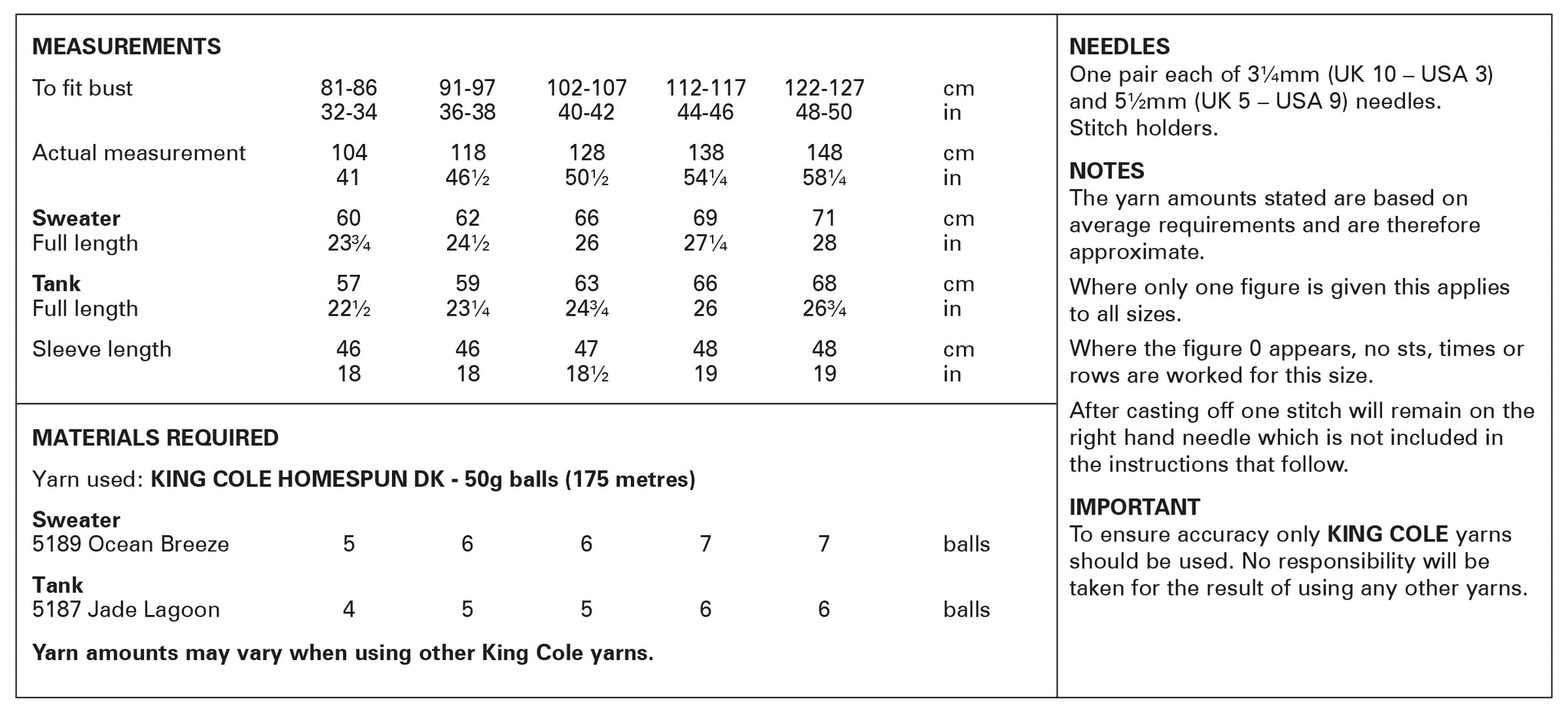 - Please see second image for suggested yarns, needle sizes and quantities required to make the garments