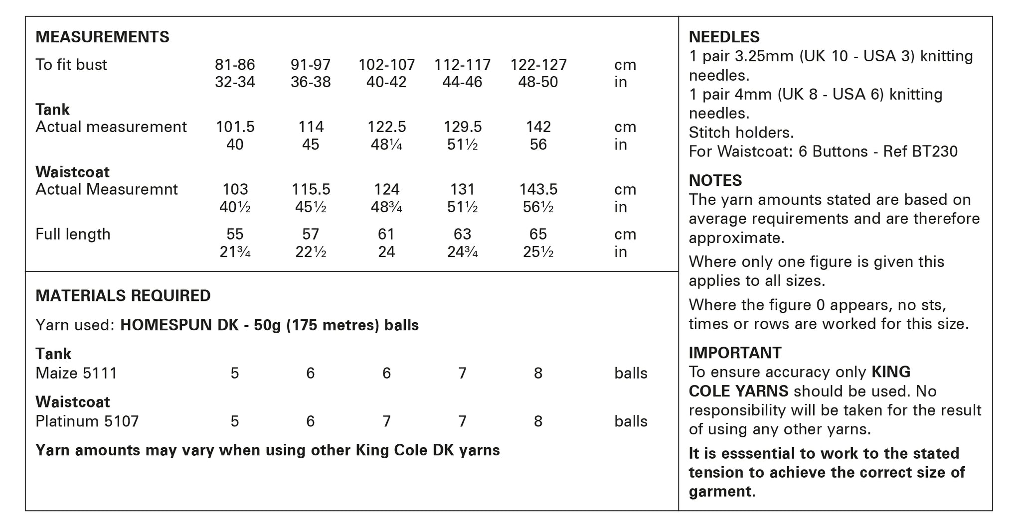 - Please see second image for suggested yarns, needle sizes and quantities required to make the garments