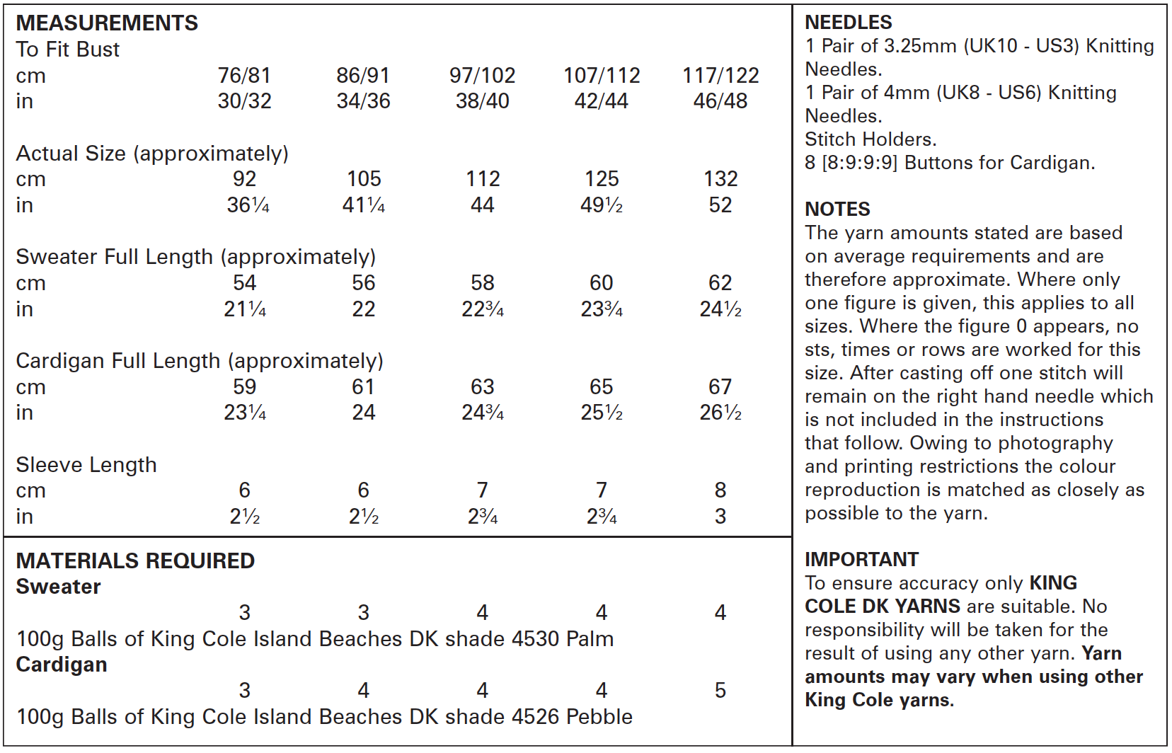 - Please see the second image for garment/item sizes and number of balls/needles required