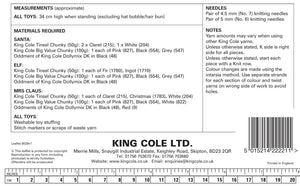 Knitting pattern by King Cole - Leaflet 9029.Christmas figuers in Tinsel Chunky; Santa, Elf, Mrs Claus.Pattern requires: 3x 50g Tinsle Chunky in 3 colours.