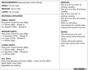 Knitting pattern by King Cole - Leaflet 9031.Santa in Tinsel Chunky.Pattern Features: 20-25cmPattern requires: 3-4x 50g Tinsel Chunky in 2-3 colours.