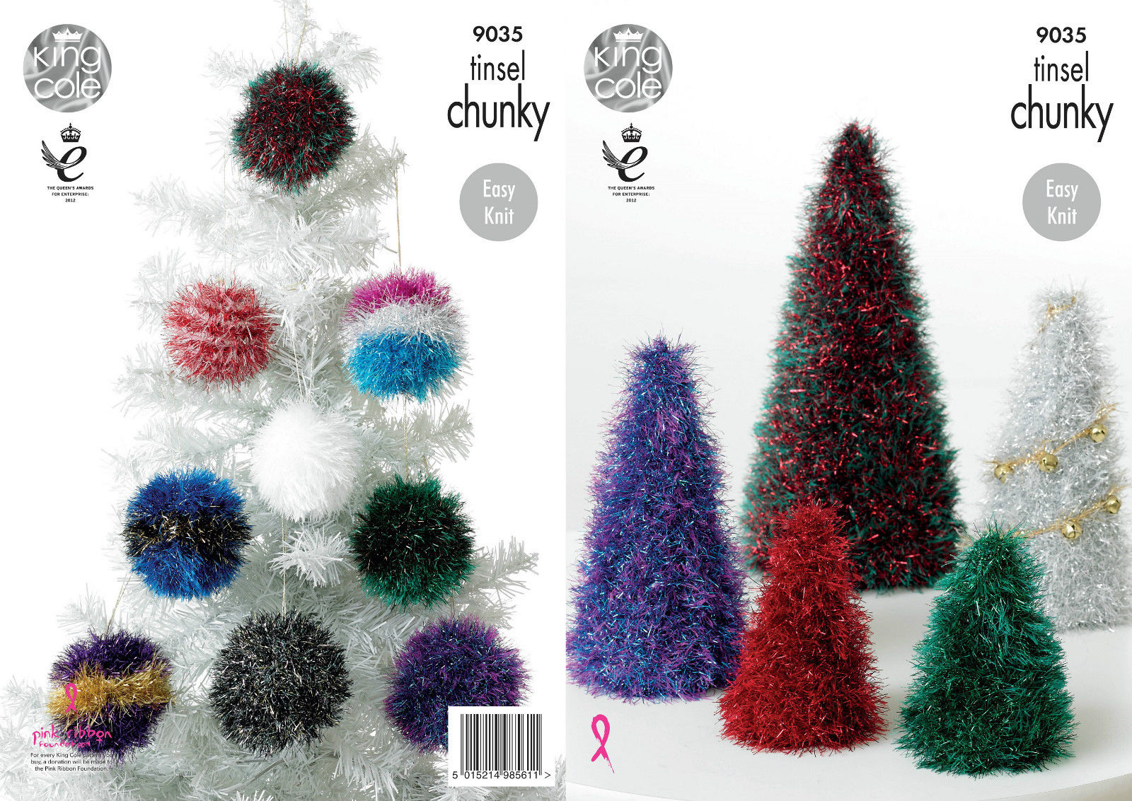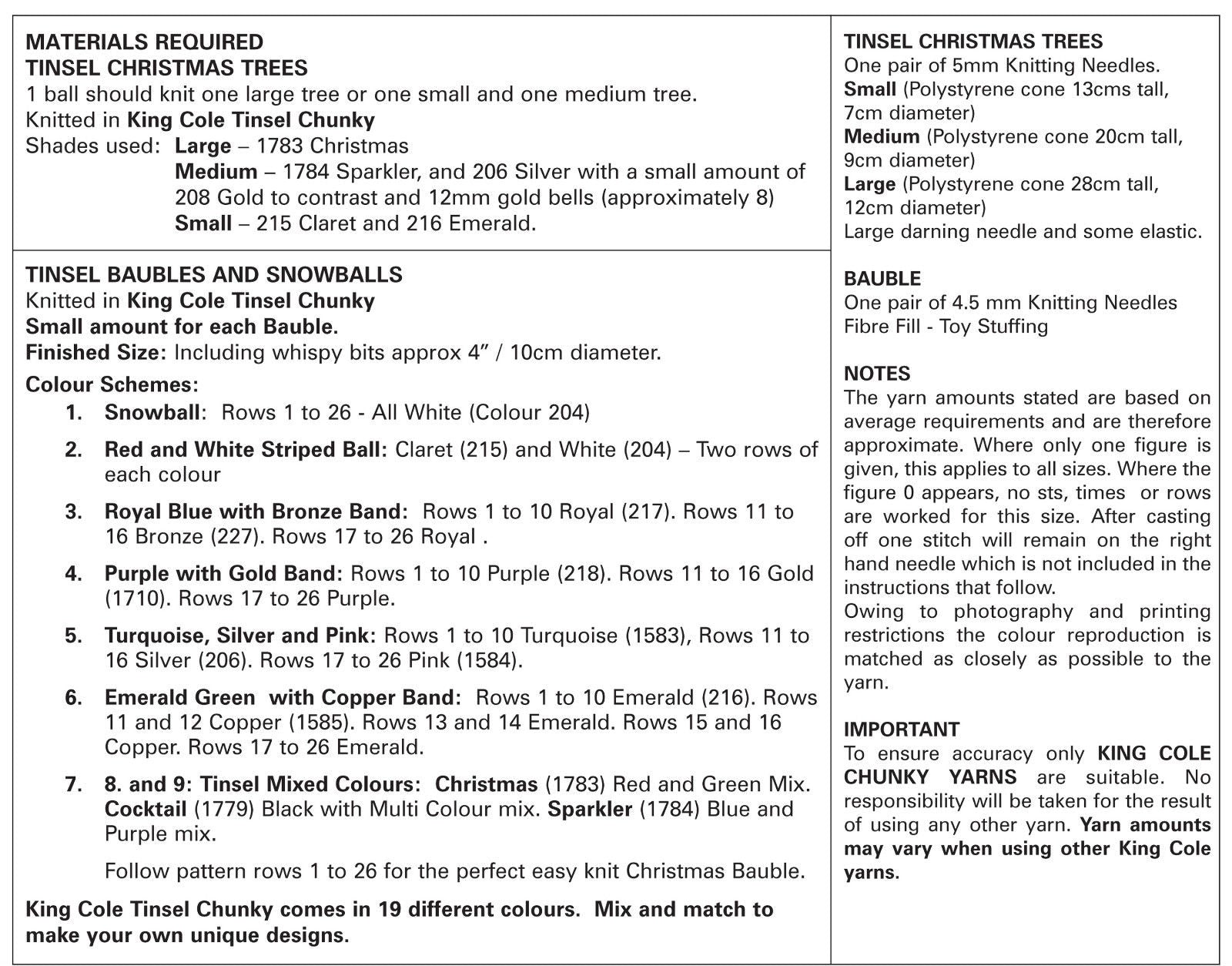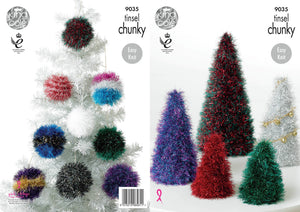 Knitting pattern by King Cole - Leaflet 9035.Christmas trees and baubels in Tinsel Chunky.Pattern Features: 13cm-28cm tall.Pattern requires: 1x 50g Tinsel Chunky makes 1 large tree or 1 small& 1 medium tree.