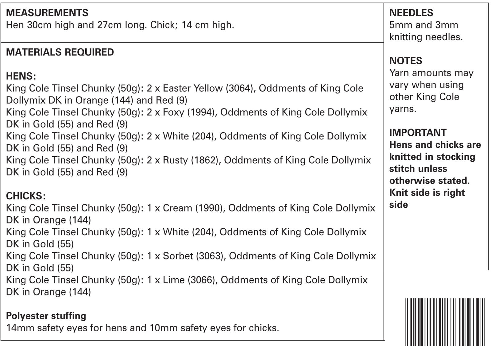 Hens; 2x 50g Tinsel Chunky.Please see the second image for garment/item sizes and number of balls/needles required.This pattern is suitable with Tinsel Chunky, we recommend making a tension square prior to knitting.Please note: this is for the pattern and not the finished product.We do not fold our patterns and all patterns are sent in board-backed envelopes.