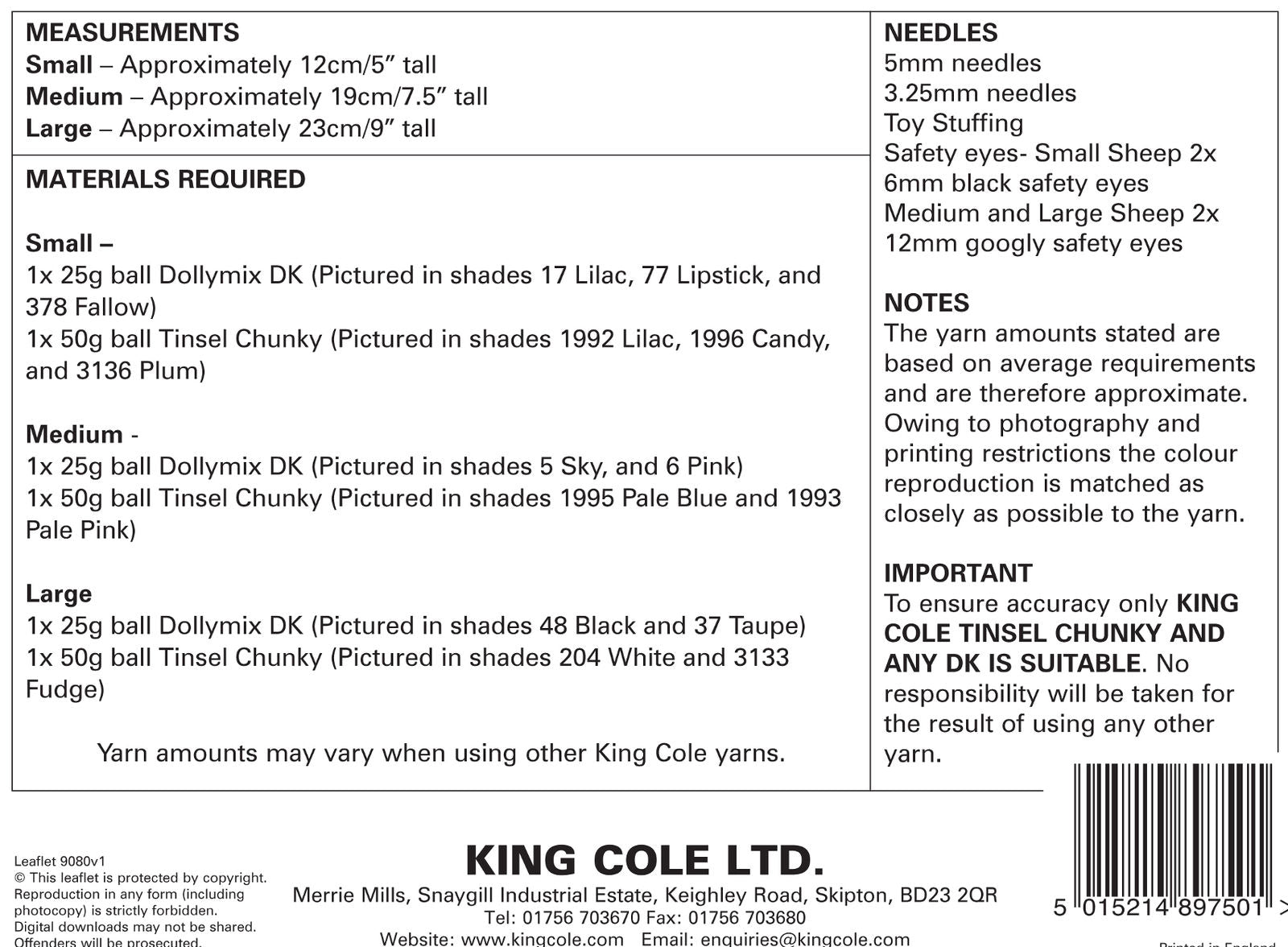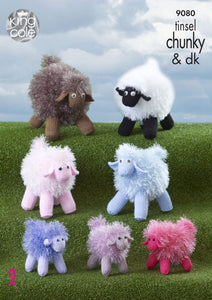 Knitting pattern by King Cole - Leaflet 9080.Sheep in Tinsel Chunky.Pattern Features: Small; 12cm.