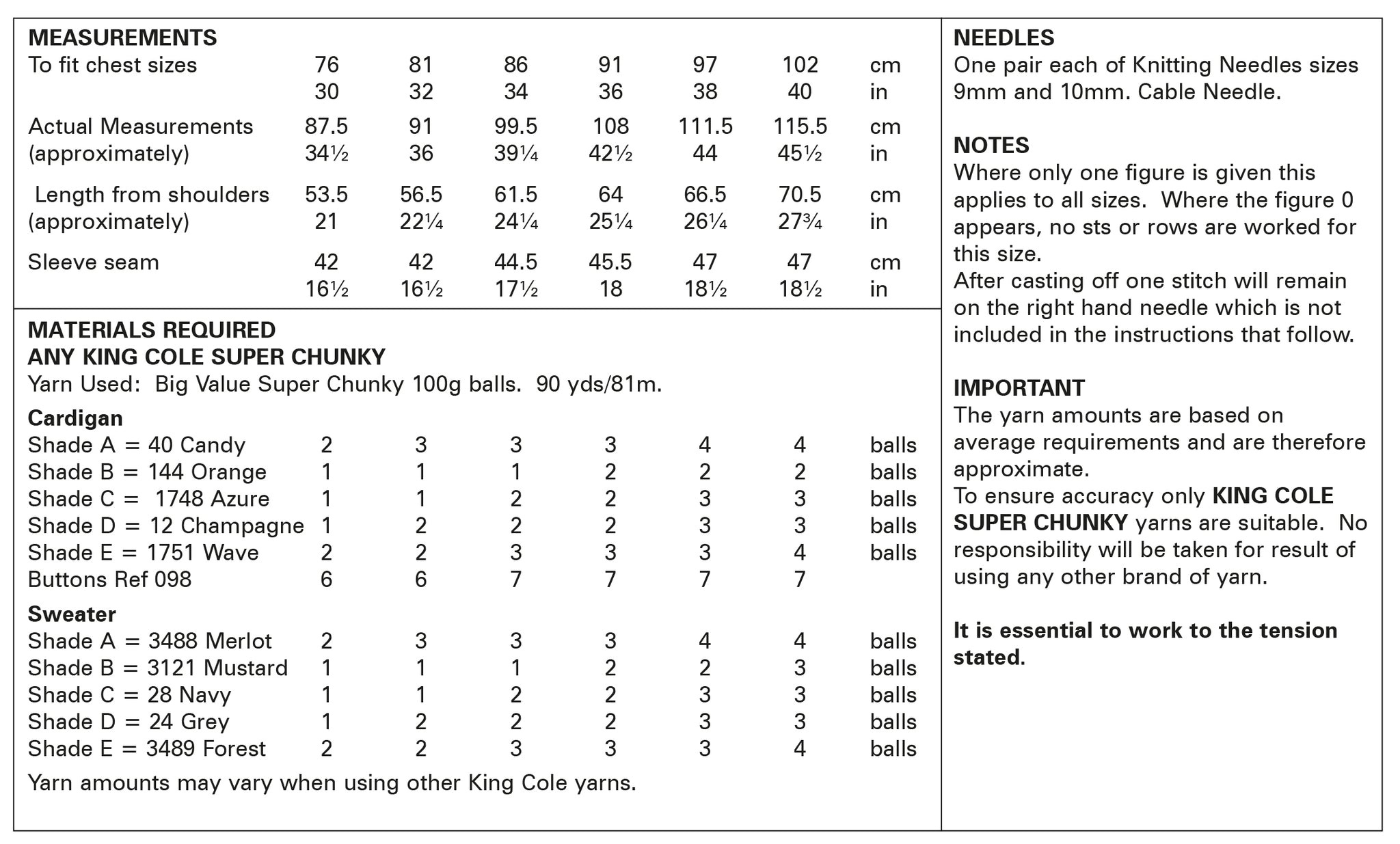 - Please see second image for suggested yarns, needle sizes and quantities required to make the garments