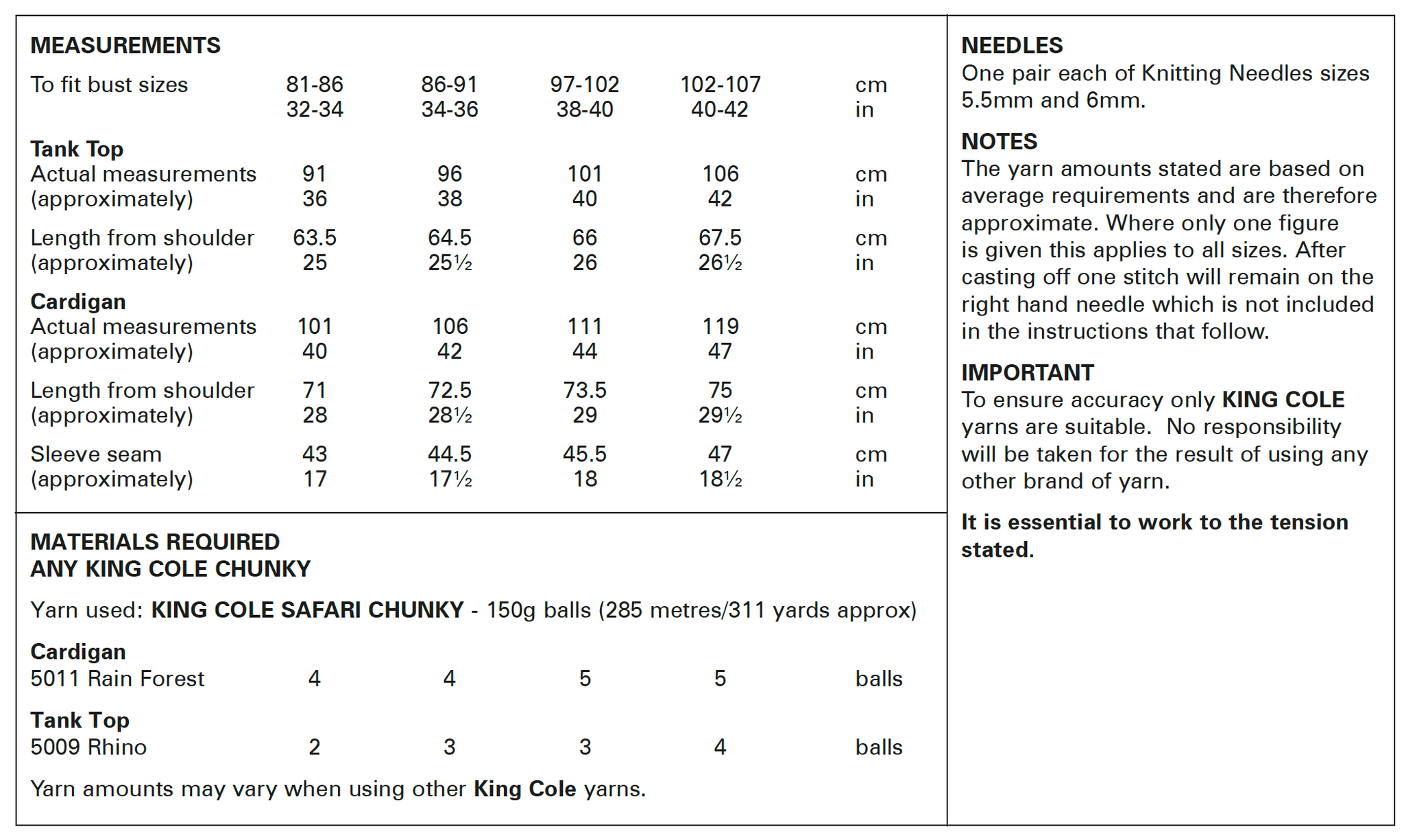 - Please see second image for suggested yarns, needle sizes and quantities required to make the garments