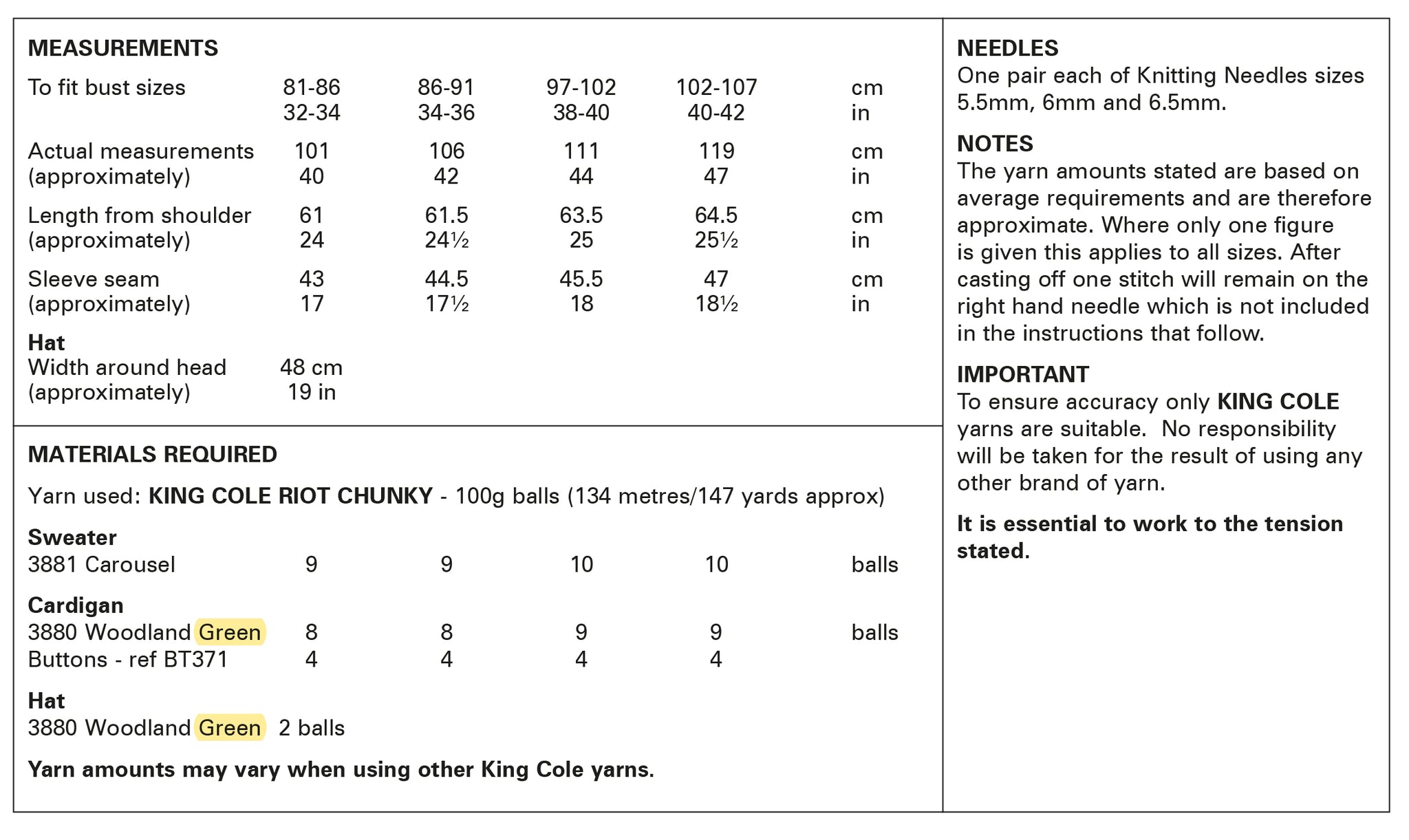 - Please see second image for suggested yarns, needle sizes and quantities required to make the garments