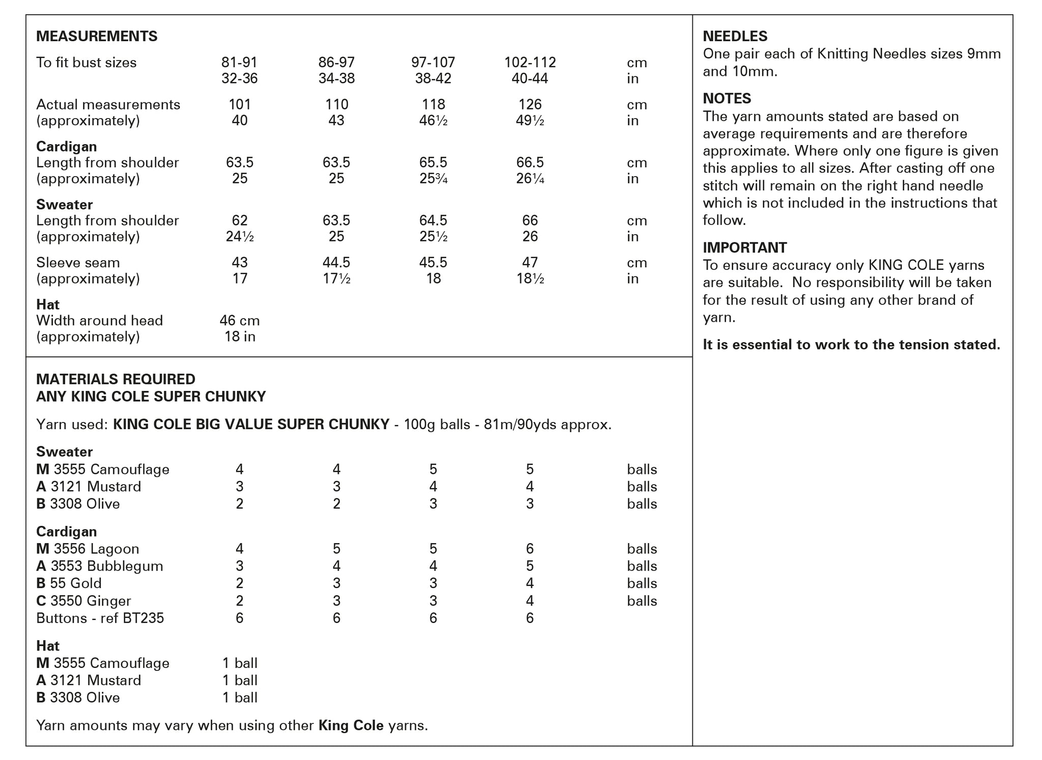 - Please see second image for suggested yarns, needle sizes and quantities required to make the garments