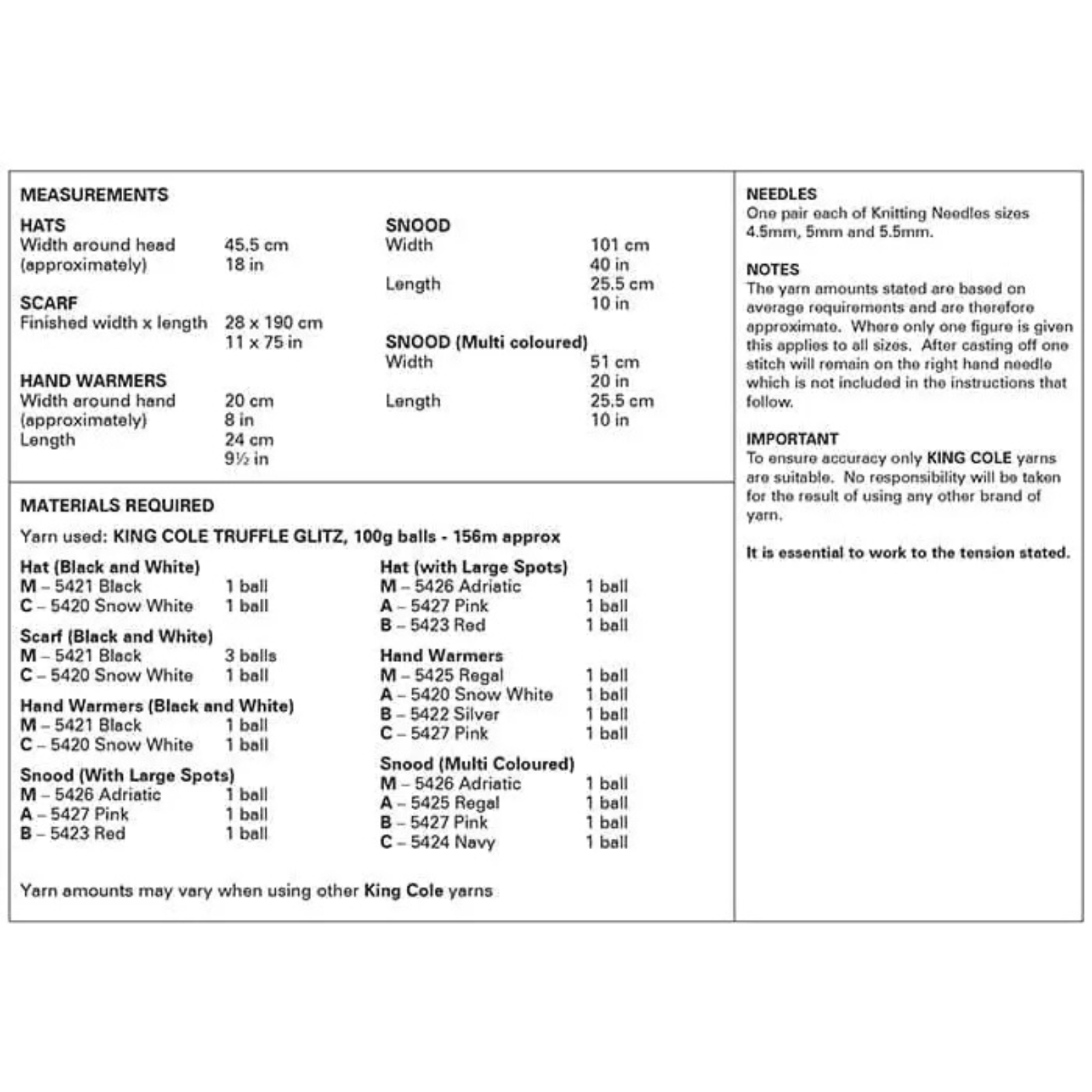 - Please see second image for suggested yarns, needle sizes and quantities required to make the garments