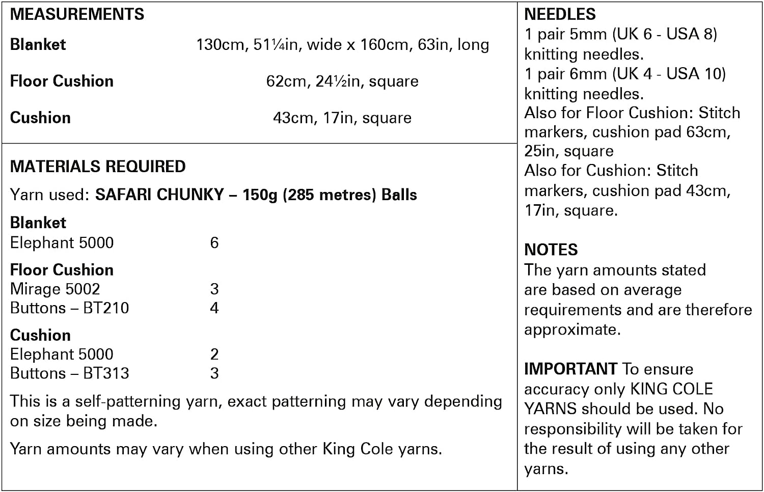 - Please see second image for suggested yarns, needle sizes and quantities required to make the garments