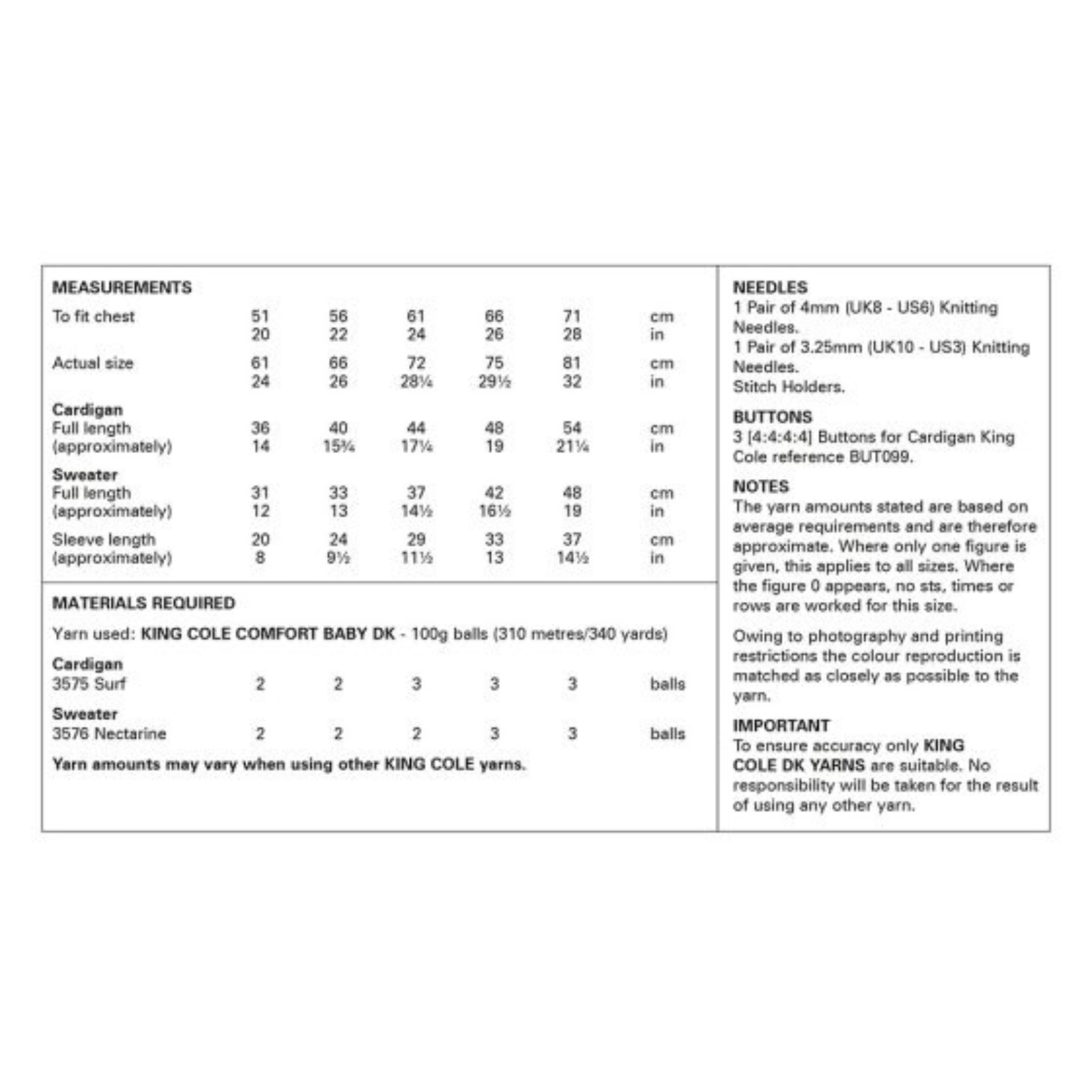- Please see second image for suggested yarns, needle sizes and quantities required to make the garments