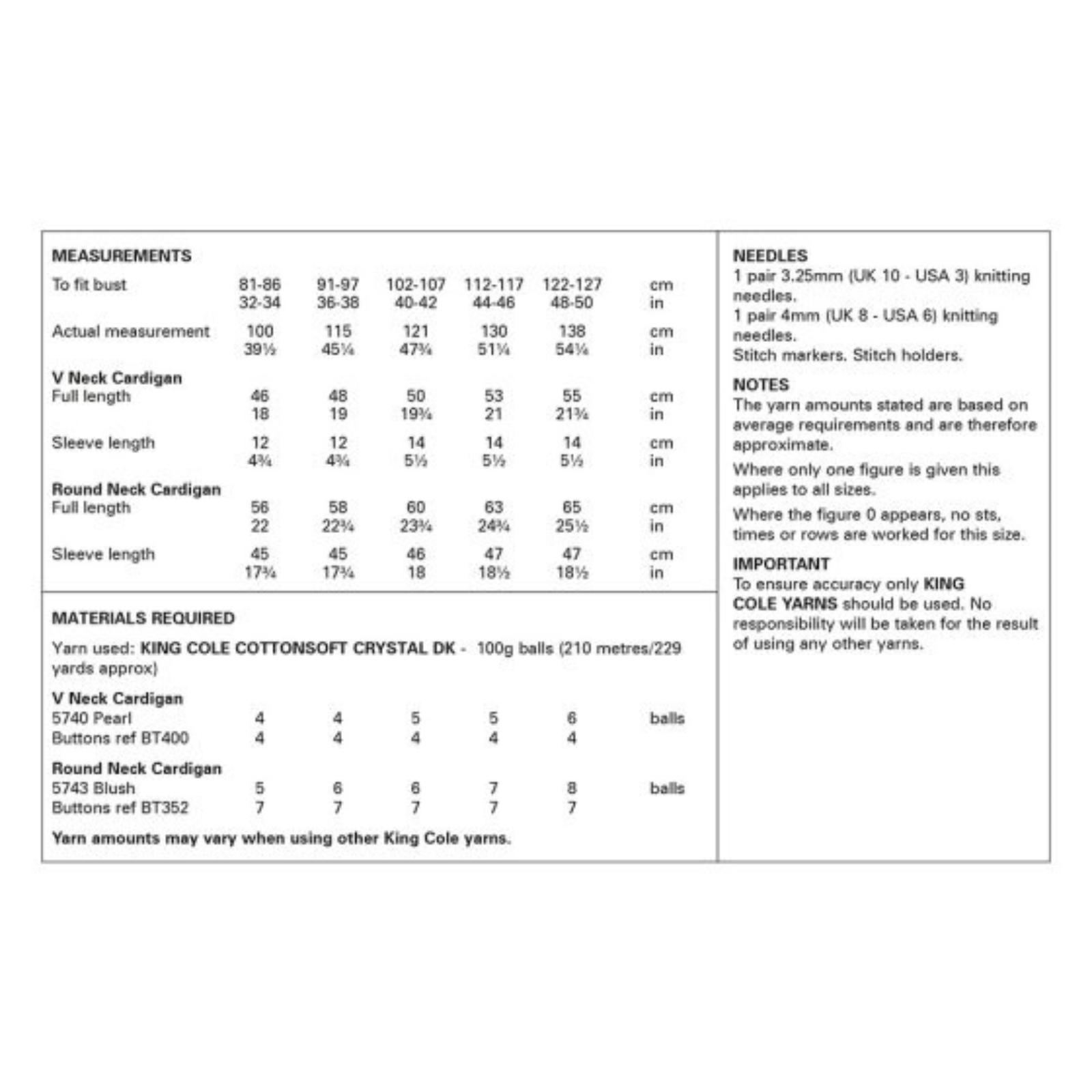 - Please see second image for suggested yarns, needle sizes and quantities required to make the garments