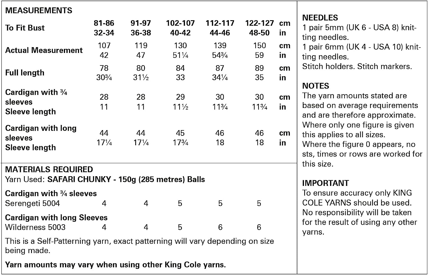 - Please see second image for suggested yarns, needle sizes and quantities required to make the garments