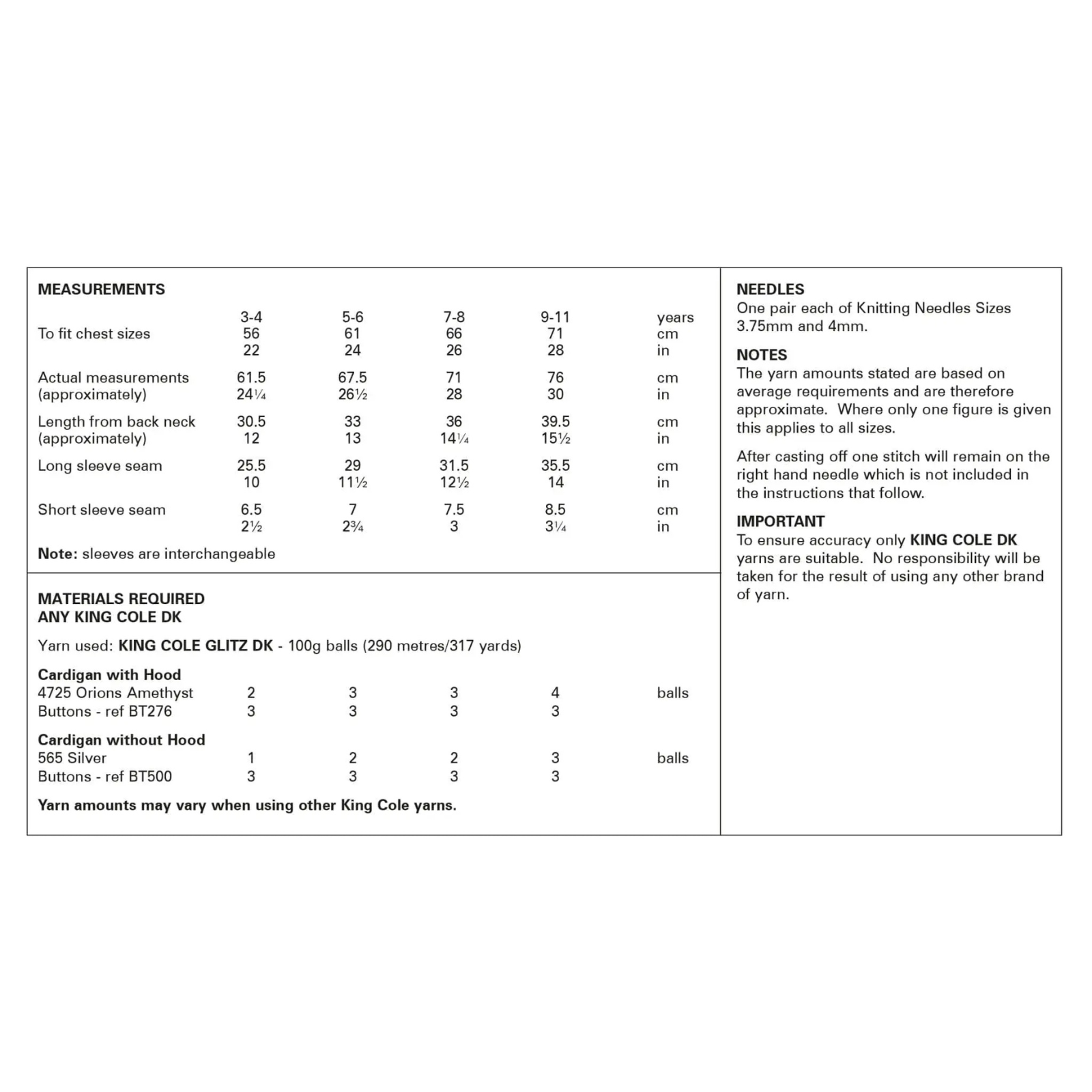 - Please see second image for suggested yarns, needle sizes and quantities required to make the garments