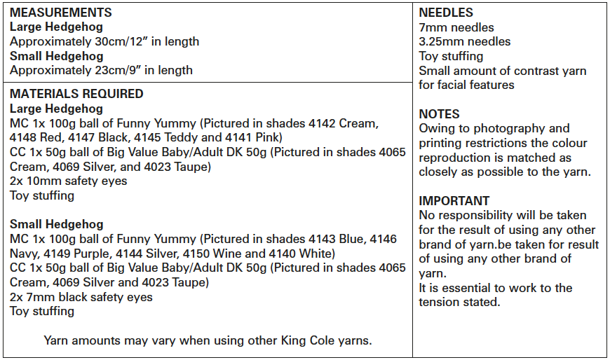 King Cole Toy Hedgehogs - Funny Yummy & DK Yarn 9135