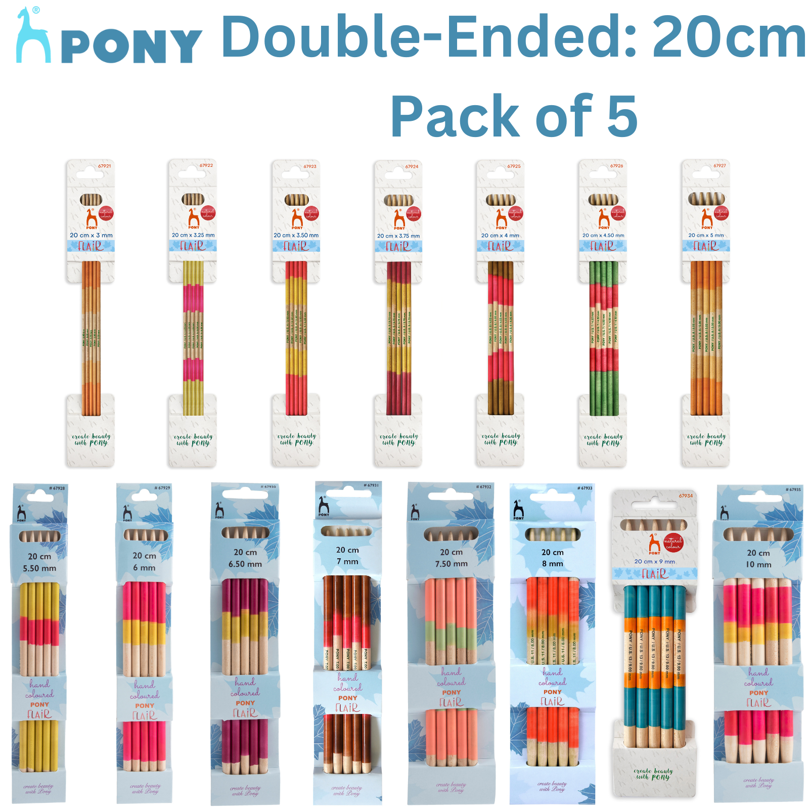 Pony Knitting Pins: Double-Ended: Set of 5: Flair: Hand Coloured 20cm