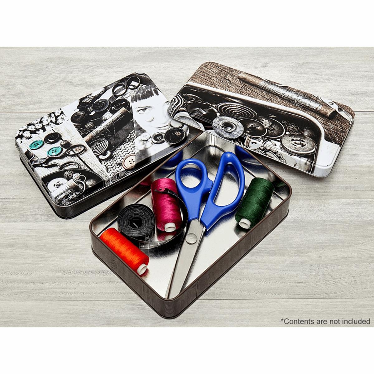 - Ideal tins for storing your sewing notions, buttons, threads, scissors and much more