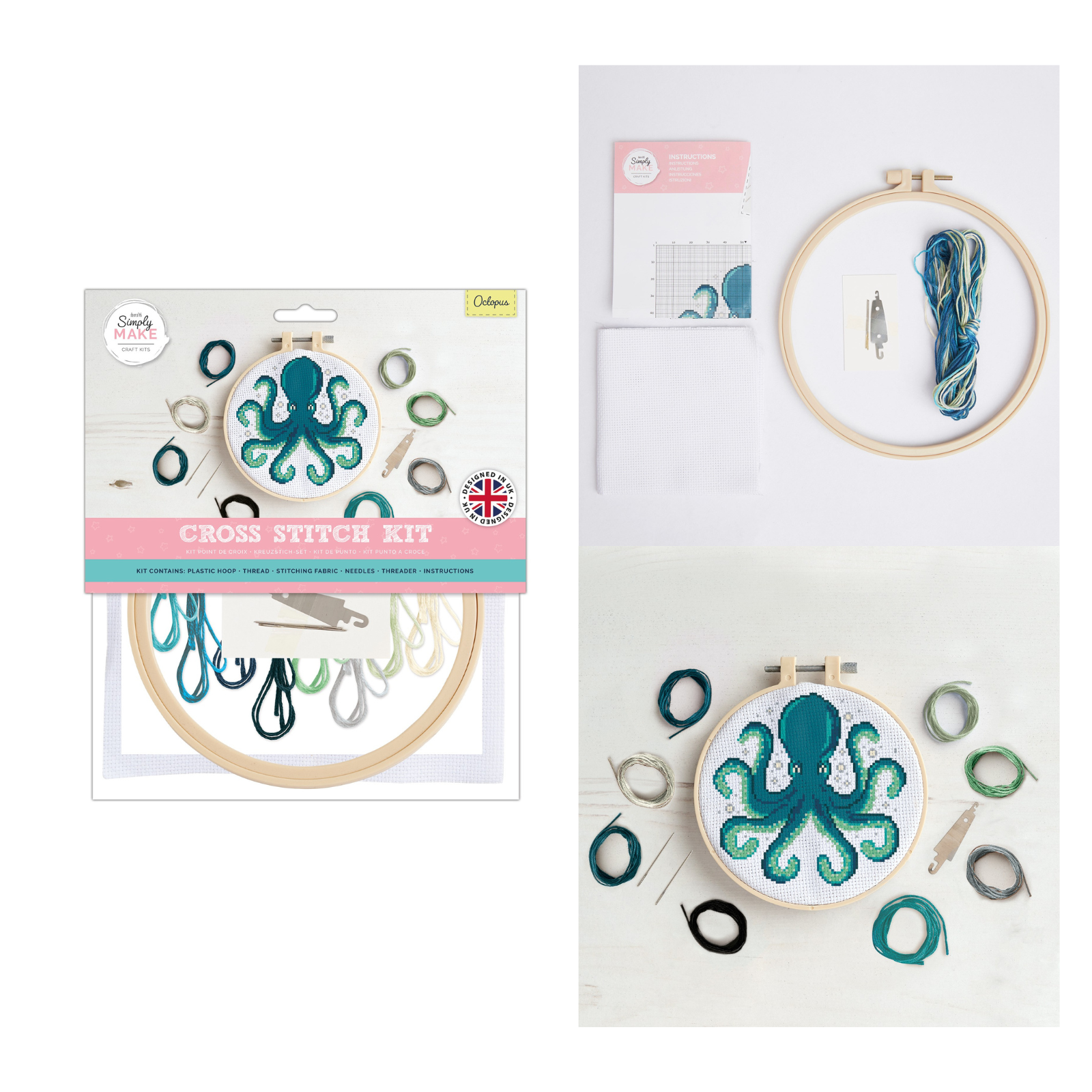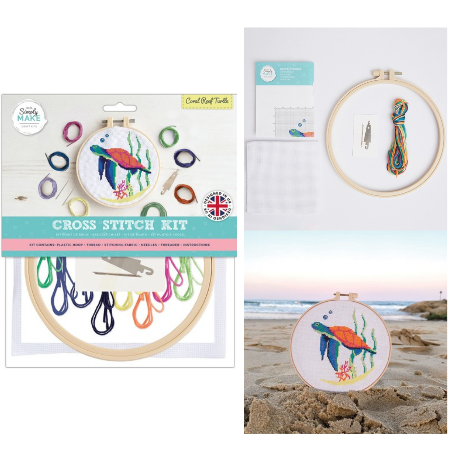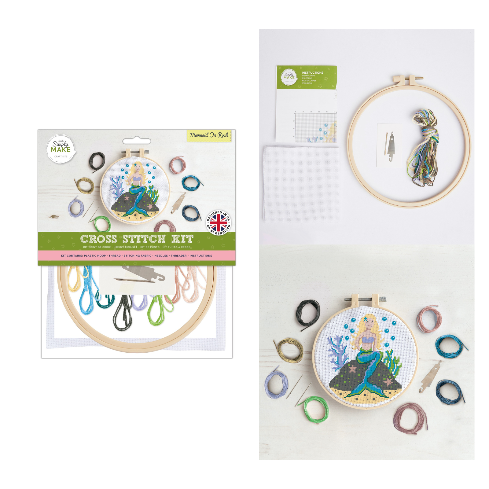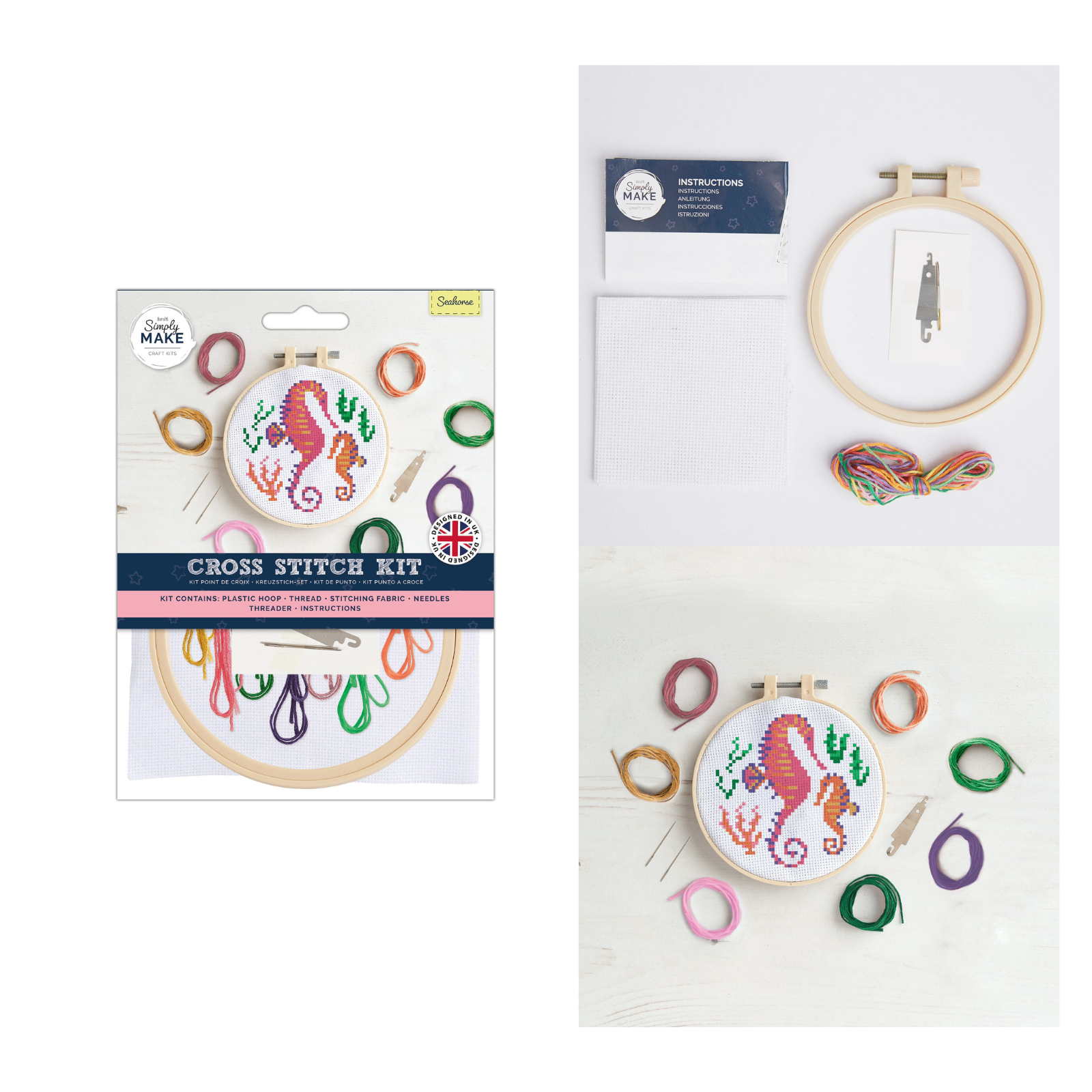 - Simply Make range kits includes: plastic hoop, threads, stitching fabric, 2x needles threader and instructions