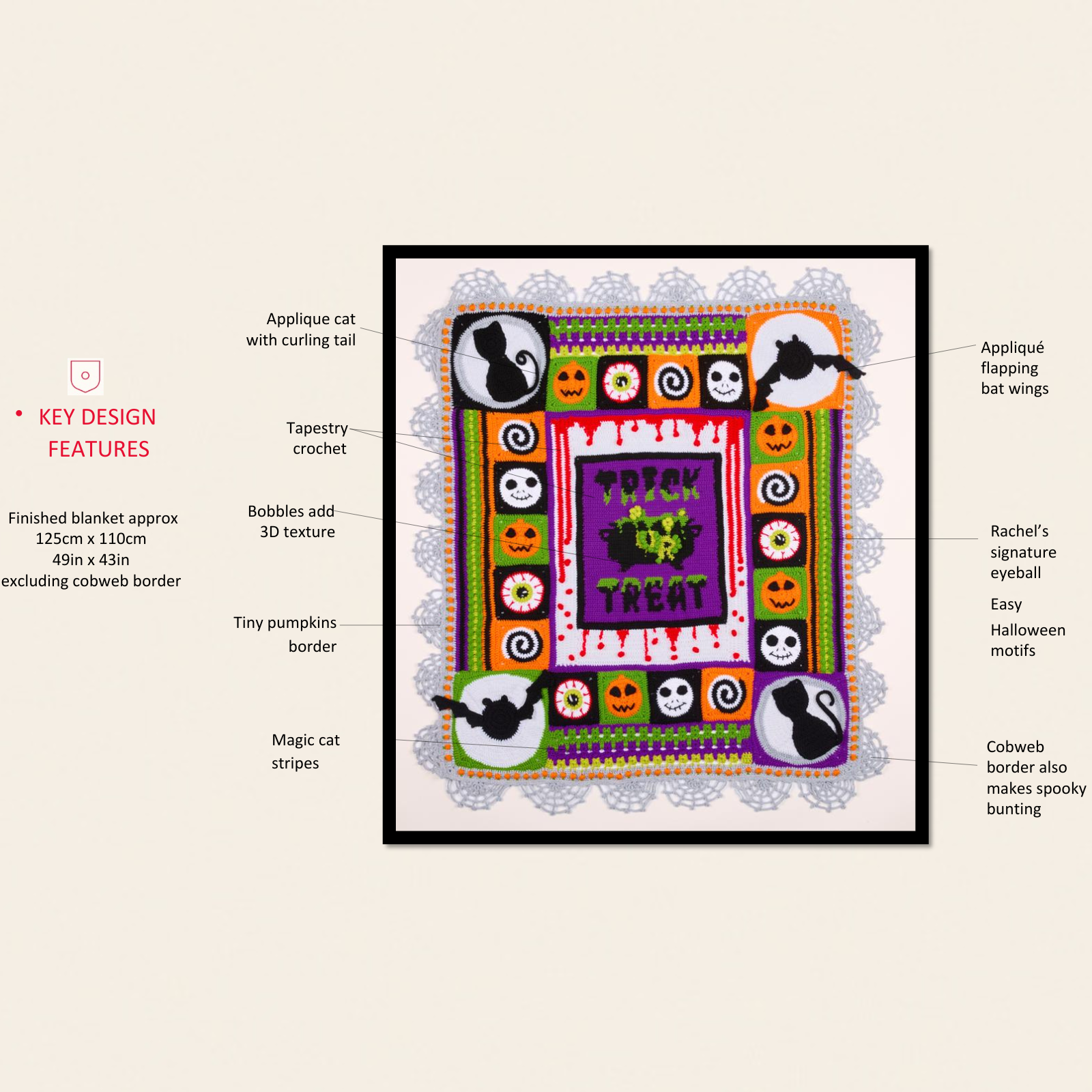 - This blanket is bursting with colour and texture, packed with pumpkins, bobbles, bats, eyeballs, and magic cats