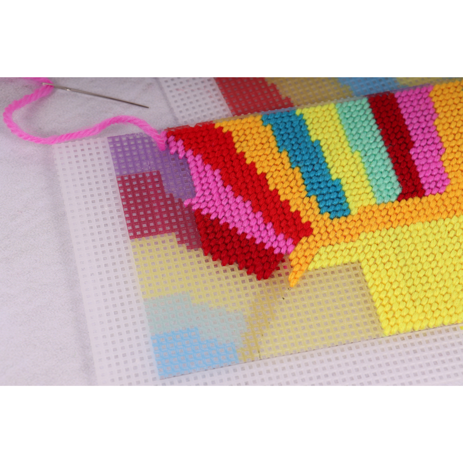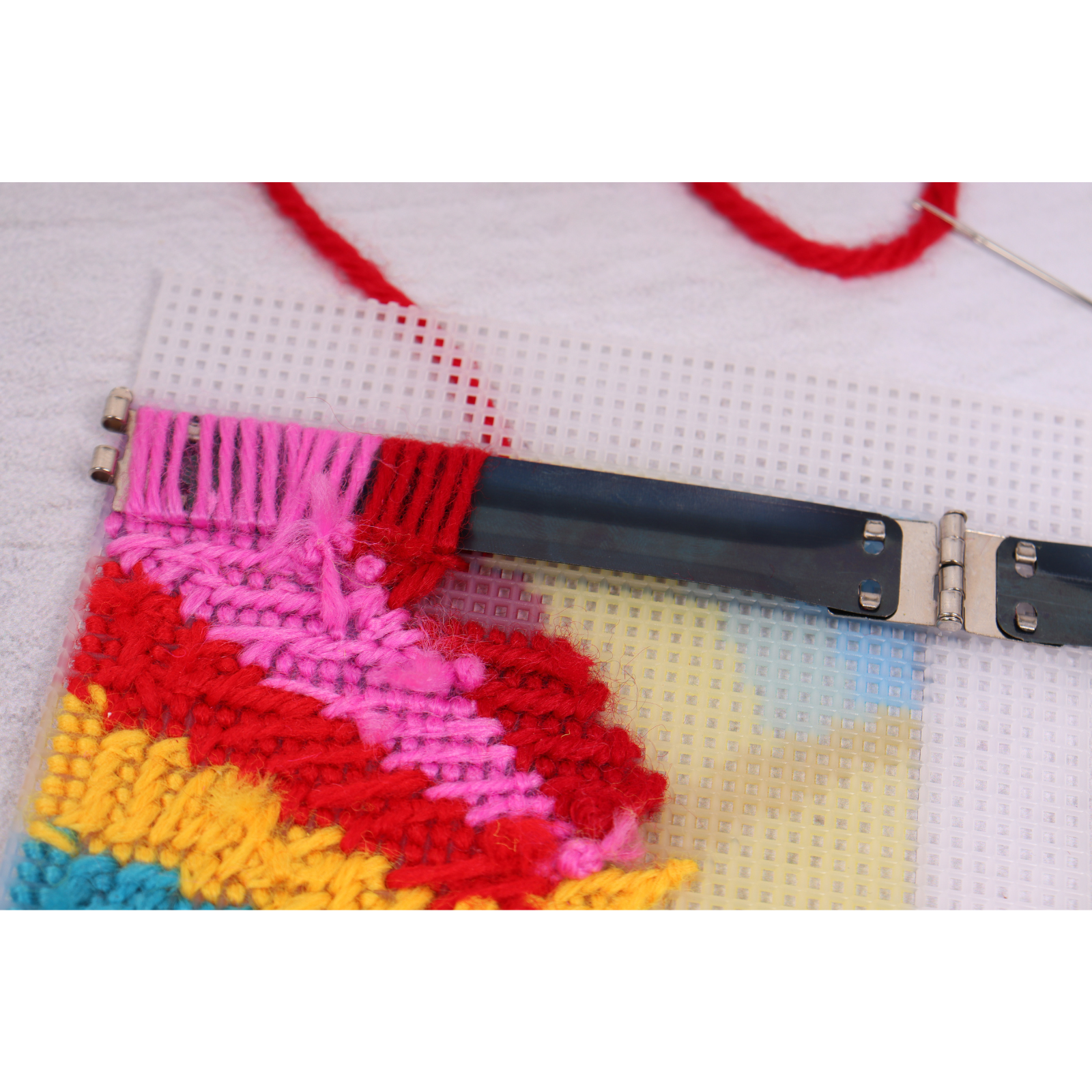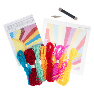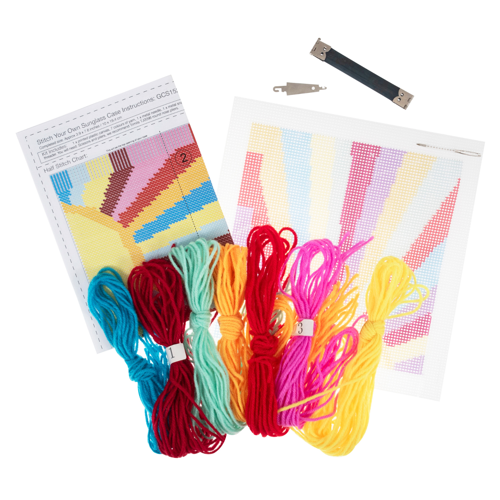 - Kit includes: printed plastic canvas, polyester yarn, metal needle, needle threader, metal snap closure, small metal cylinder to secure snap closure, full colour coded chart and instructions
